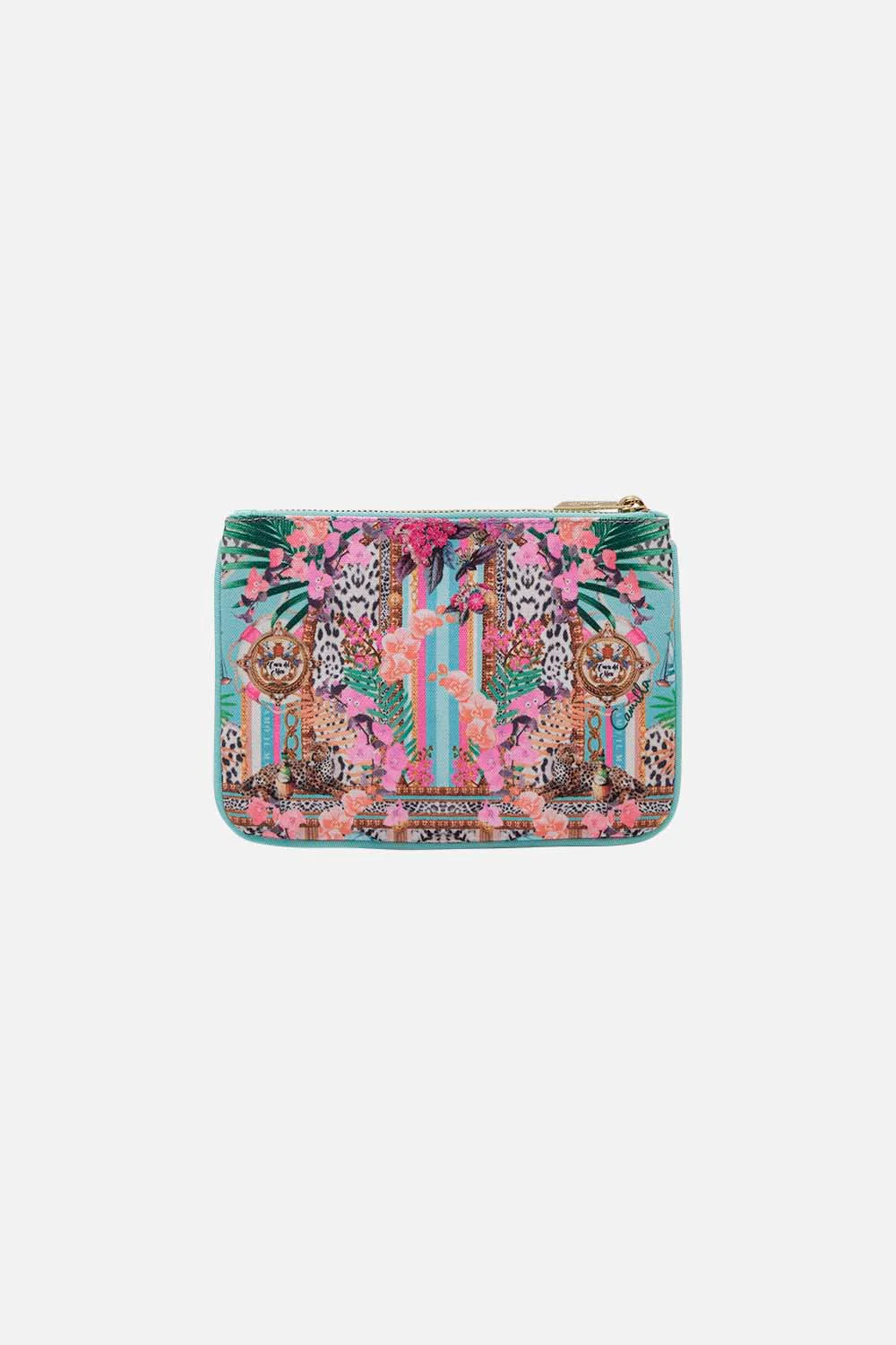 The Dear Amore Mio Coin And Phone Purse depicts a world of lush foliage and feline motifs dancing amongst golden archways. An elevated essential, this luxury phone and coin purse is home to a petite size for your most essential treasures, gold zip fastening that echos the metallics accents upon the customised print and sensationally piped trim. Lovingly crafted, designed in Australia. Explore more from the Amore Mio collection.